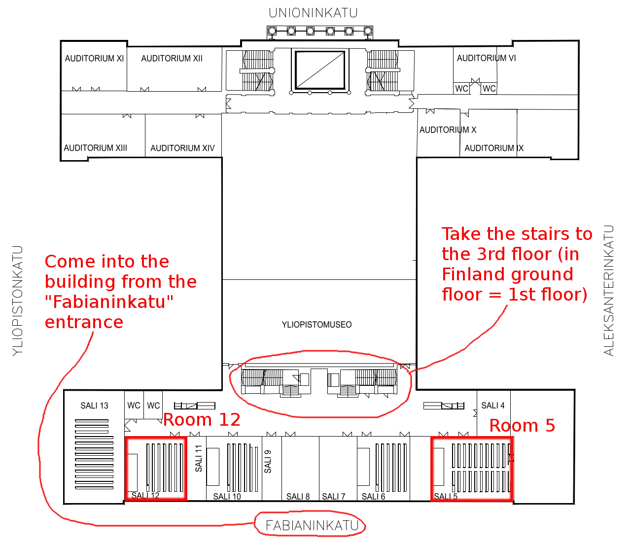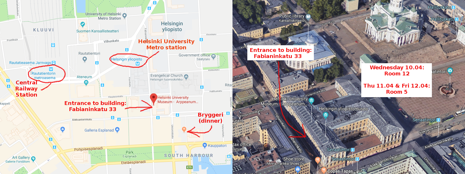 The presentations will take place in lecture hall 12 (Wednesday 10th) and lecture hall 5 (Thursday 11th and Friday 12th) in the University of Helsinki main building in Fabianinkatu 33. The building, which also contains the University Museum, is impossible to miss, next to the Helsinki Cathedral in Senate Square. To reach the lecture halls, you need to enter the building from the Fabianinkatu entrance (see map below) and go upstairs from there. The dinner venue is also conveniently located close to the workshop venue.